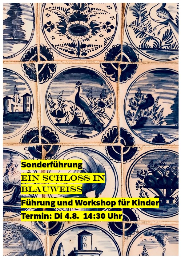 Überall blauweiß – Teller, Vasen und sogar Möbel tragen im Schloss diese Farben. Tausende von blauweißen Fliesen schmücken Wände, Treppen und Kamine. Warum Markgräfin Sibylla Augusta diese Farben liebte, wird bei einem spannenden Rundgang erklärt. Anschließend können die jungen Gäste ihre eigenen Fliesen bemalen.
