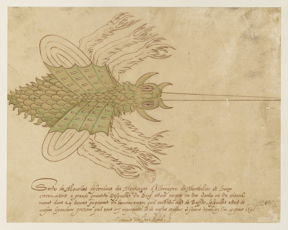 Eine Zeichnung von Jean II Rabel, einem erfolgreichen Maler, Graveur und Verleger unter den letzten Valois, zeigt eine seltsame Fliege. Eine Inschrift besagt, dass es sich um eine aus Montbéliard stammende Art handelt. Naturalistische Beobachtung oder zu interpretierendes Wunder, da Montbéliard, das viele protestantische französische Exilanten beherbergte, 1587/88 von den Guise angegriffen wurde? Wir werden die Untersuchung durchführen.