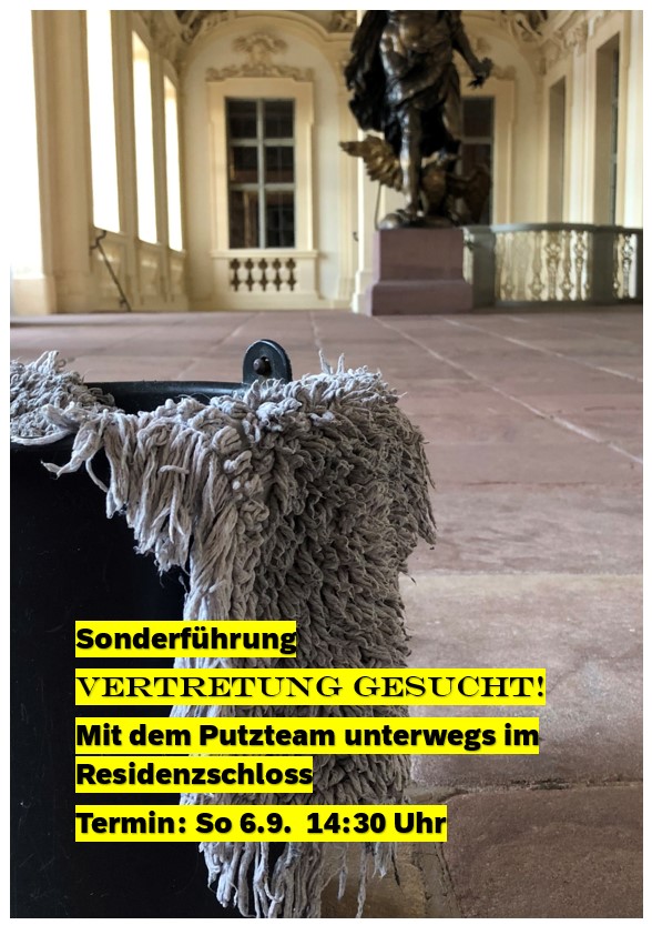 Das Team kennt jeden Winkel des Schlosses – doch es ist ziemlich urlaubsreif und sucht dringend eine Vertretung. Da kommen ihnen die Besucherinnen und Besucher am Schlosstor gerade recht. Sie übernehmen kurzerhand die Führung durch die markgräflichen Gemächer – eine blitzsaubere Schlossführung und eine besonders unterhaltsame Art, das Schloss zu entdecken.
