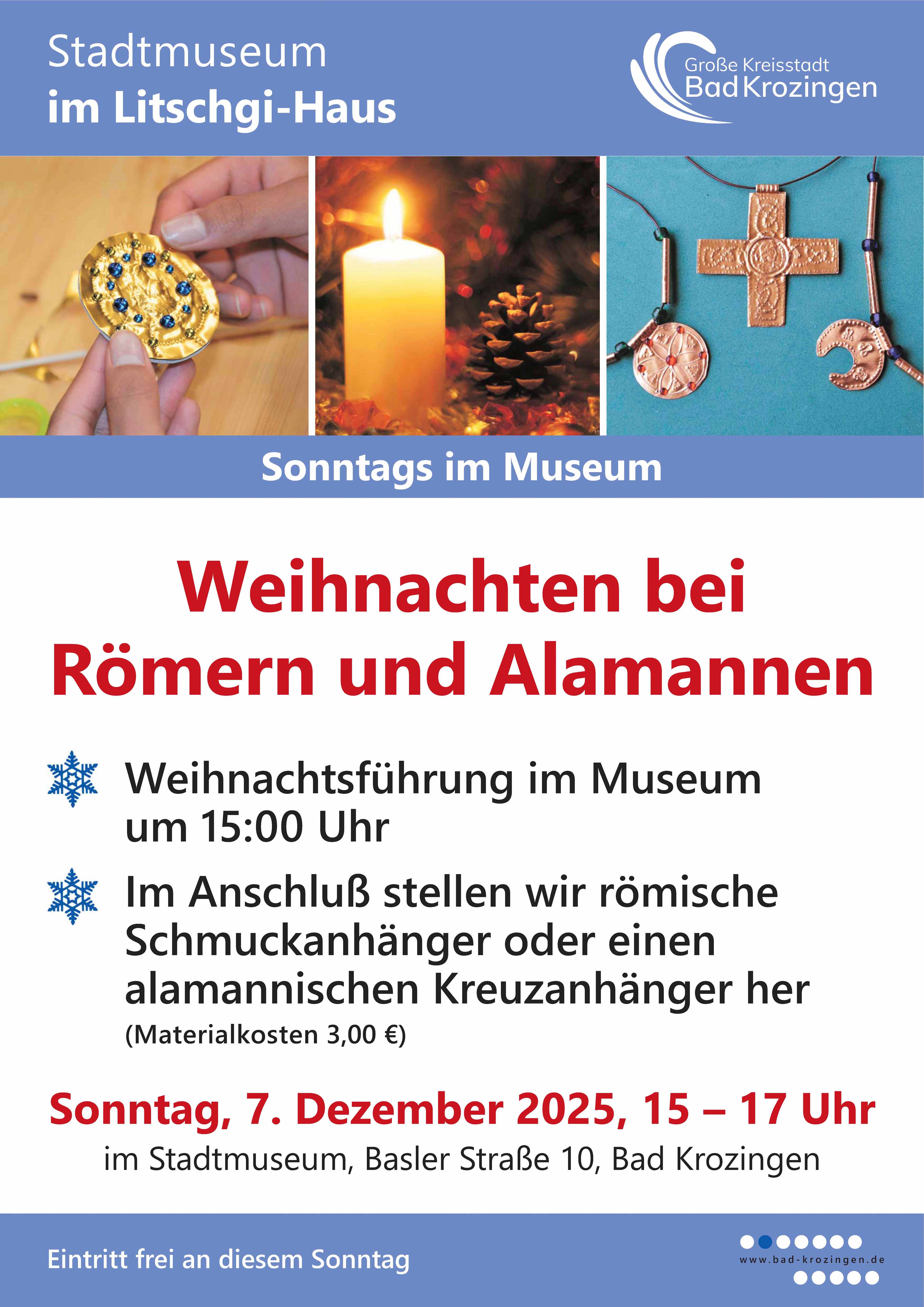 At 15:00, a Christmas tour is offered in the city museum. Afterwards we will make Roman jewelry pendants or an Alamannic cross pendant. Material costs: 3 €