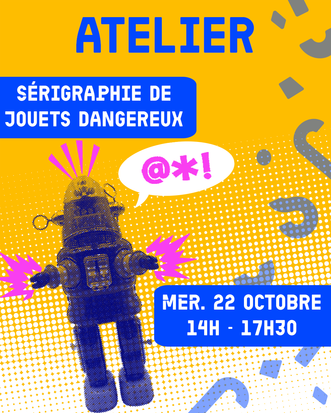 Choisirez-vous de prévenir du danger avec des pictogrammes ou de faire du jouet de ton choix l’objet le plus dangereux jamais vu ? Tout sera permis dans cet atelier créatif et ludique !