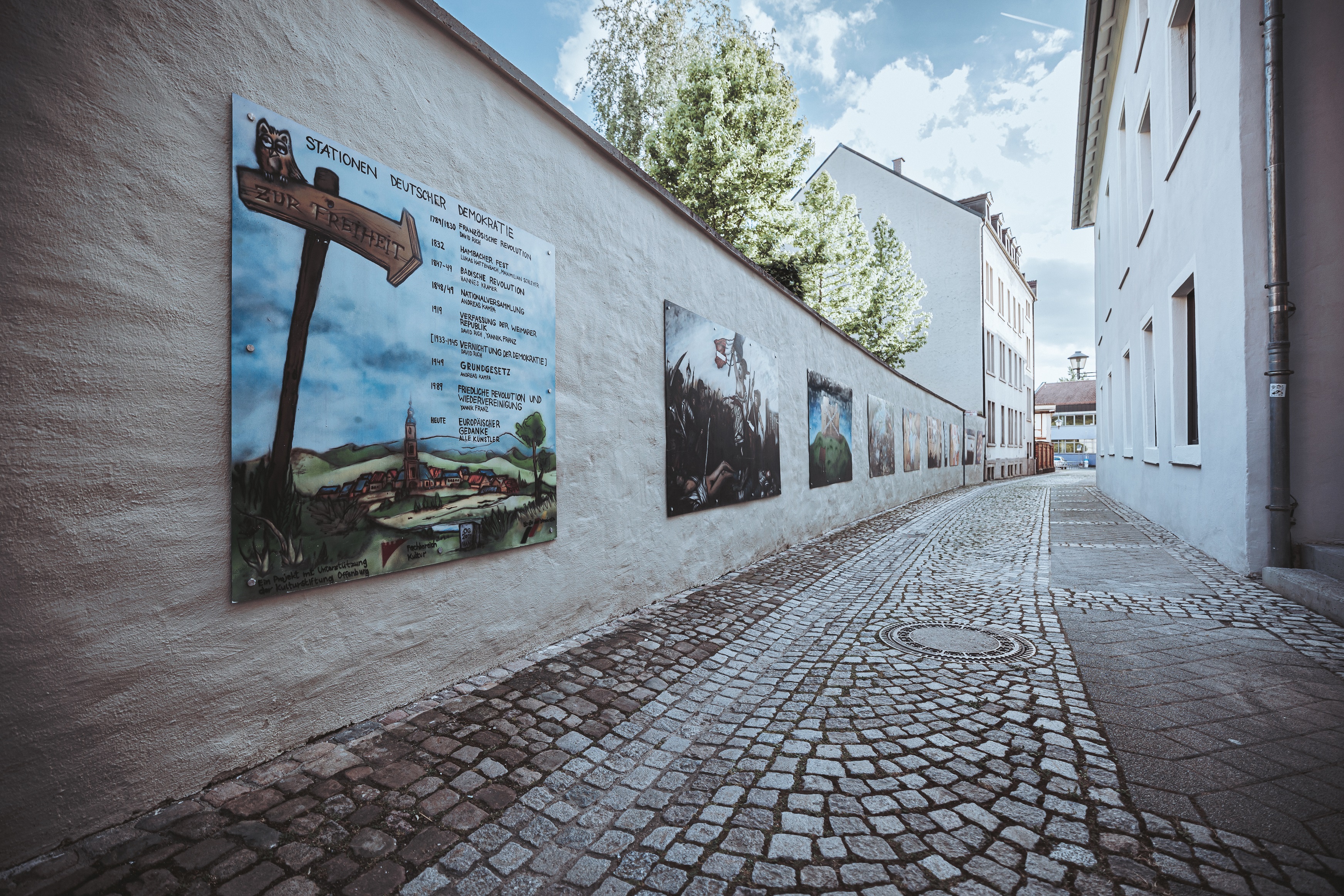 Dans la Bauerngasse, près du Salmen, 12 graffitis avec des éléments de bande dessinée et des citations d'histoire de l'art racontent différentes étapes de l'histoire de la démocratie allemande.
