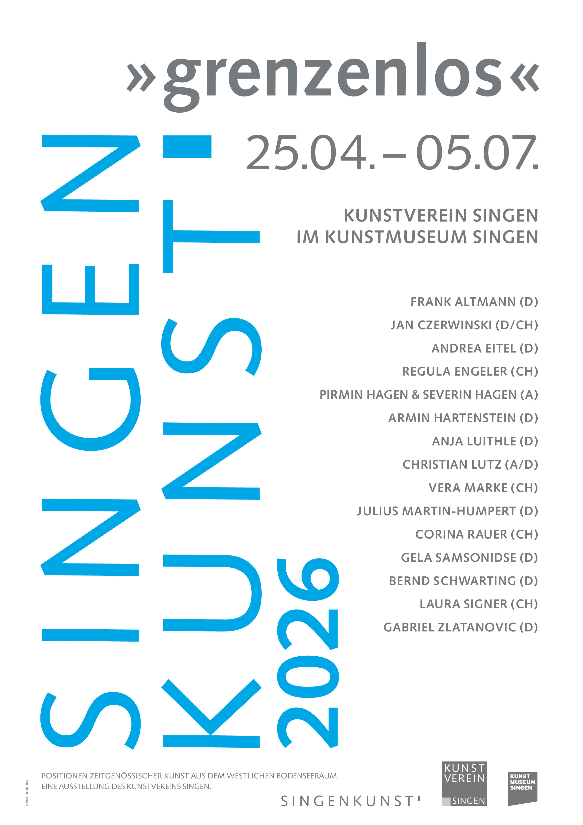 Avec l'exposition SINGENKUNST 2026 "grenzenlos", l'association artistique de Singen poursuit sa série d'expositions bisannuelles au Kunstmuseum Singen. L'objectif de cette série d'expositions est de montrer l'étonnante diversité et la vitalité de l'art de la région transfrontalière des quatre pays du lac de Constance, ainsi que de créer et de rendre visible une plateforme publique pour de jeunes artistes ou des positions moins connues jusqu'à présent dans cette région.