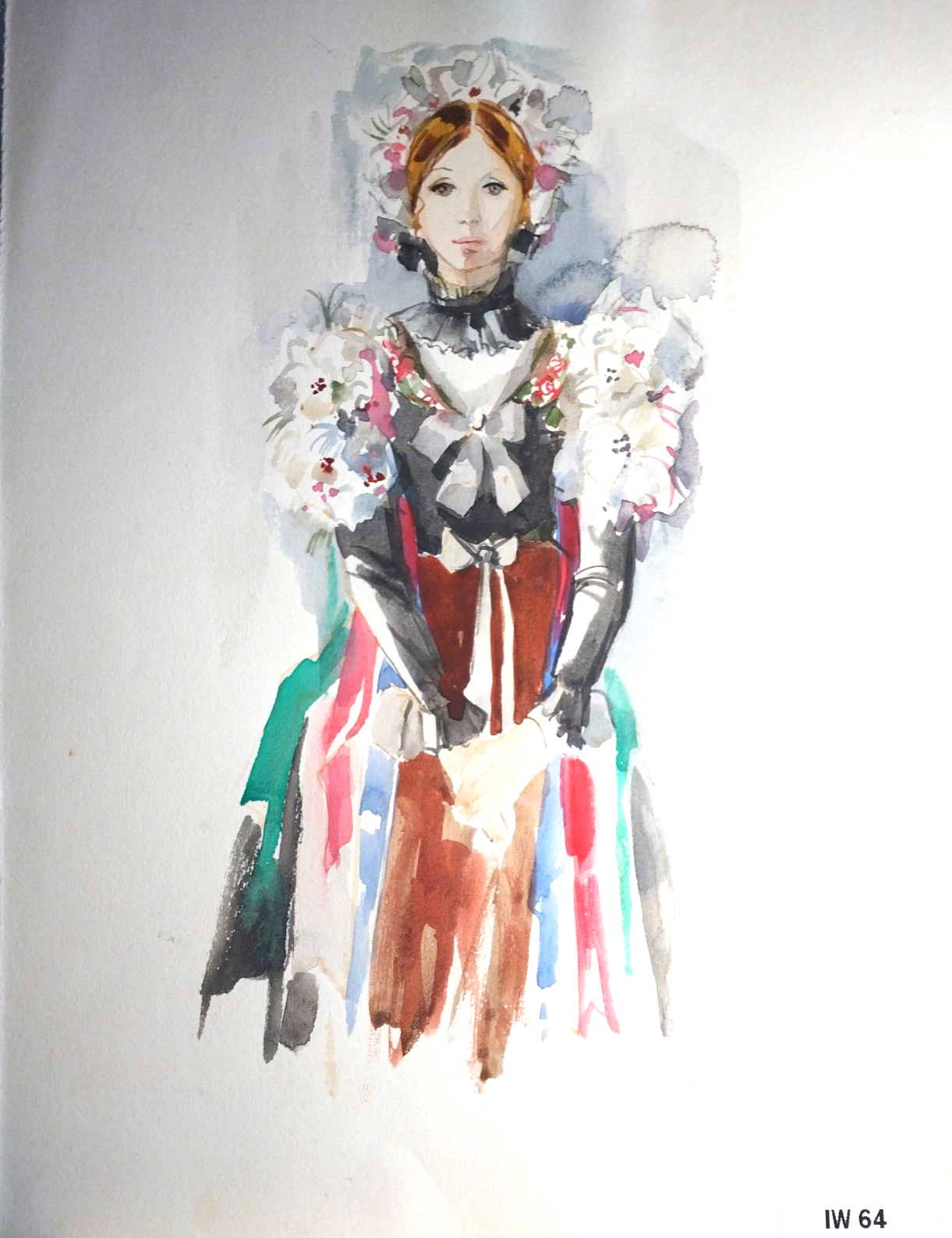 Formée aux Arts décoratifs dans les années 1940, Inès Wagner mène une carrière protéiforme entre illustration de presse, arts plastiques et scène théâtrale. Son parcours prend un tournant marquant lorsqu’elle conçoit les costumes du Barabli, la scène strasbourgeoise, pour une quarantaine de spectacles. Son trait délicat et son travail virtuose de l’aquarelle, tout en transparence et en nuances, font d’elle une observatrice sensible de l’humain, attentive aux visages comme aux atours.