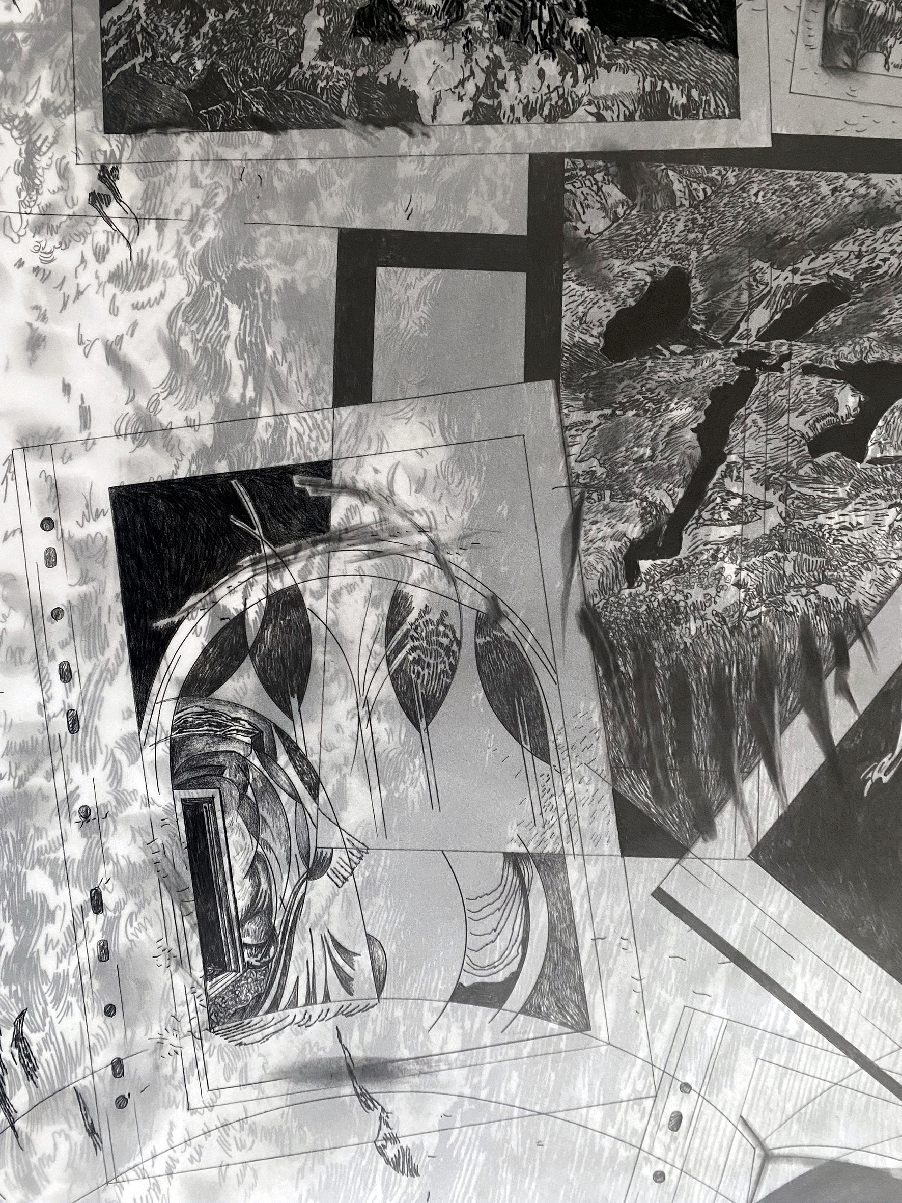 Ici, dans une salle assombrie, cinq feuilles de zinc de deux mètres de haut flottent dans l’espace. Chacune sert de support sur ses deux faces à deux dessins superposés, le premier imprimé sur papier et le second réalisé sur calque. Par stratification, ce dernier semble se creuser, alors que par nos yeux, notre corps est aspiré dans un dédale d’images composites aussi anachroniques qu’étranges. C’est un sombre enchevêtrement de formes et de motifs dessinés au crayon graphite d’où émergent des intérieurs mystérieux évoquant les demeures du XIXe siècle, des chevelures et des papillons qui semblent vouloir fuir, des ciels tourmentés, des drapés rappelant les volutes de fumées volcaniques des gravures de Fabris, des vagues qui voudraient tout engloutir, des montagnes menaçantes, une silhouette humaine dont on ne devine qu’un incertain profil mais qui déjà se fait rocher, comme pétrifiée dans un univers explosé : la vision d’un violent et lugubre tremblement du monde dont l’œuvre raconte toute entière l’histoire, jusqu’au dernier dessin où se profile un soupçon de printemps.